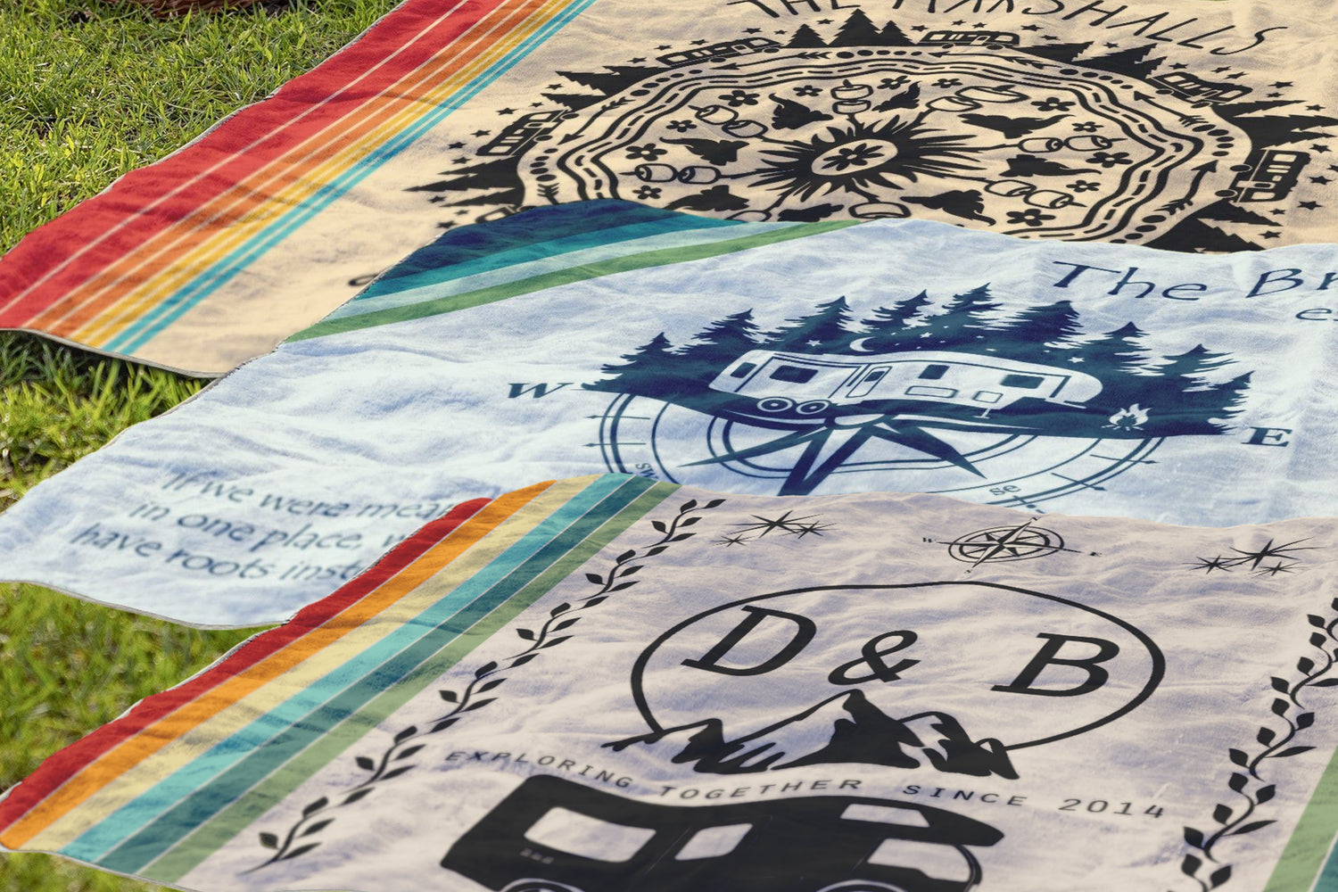 So we found a blanket with a water resistant bottom layer and crafted some cool camping themed designs for the top layer!