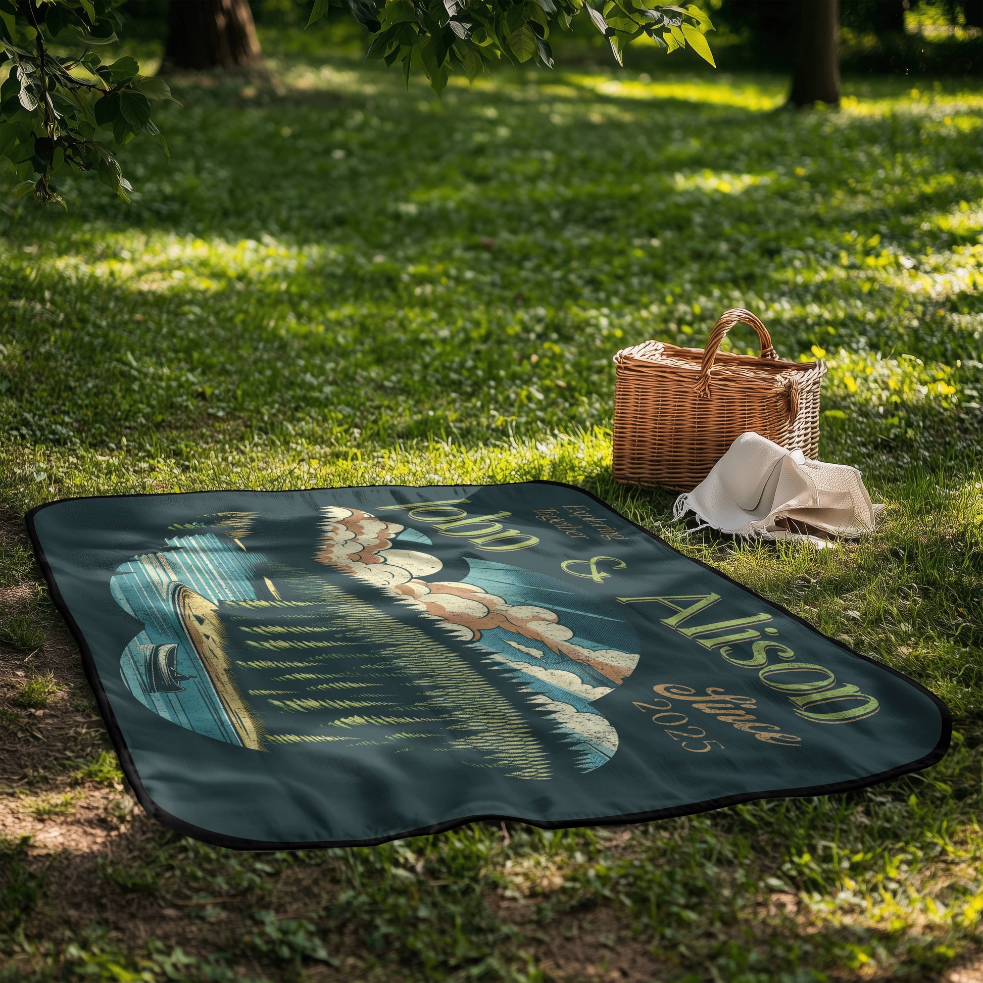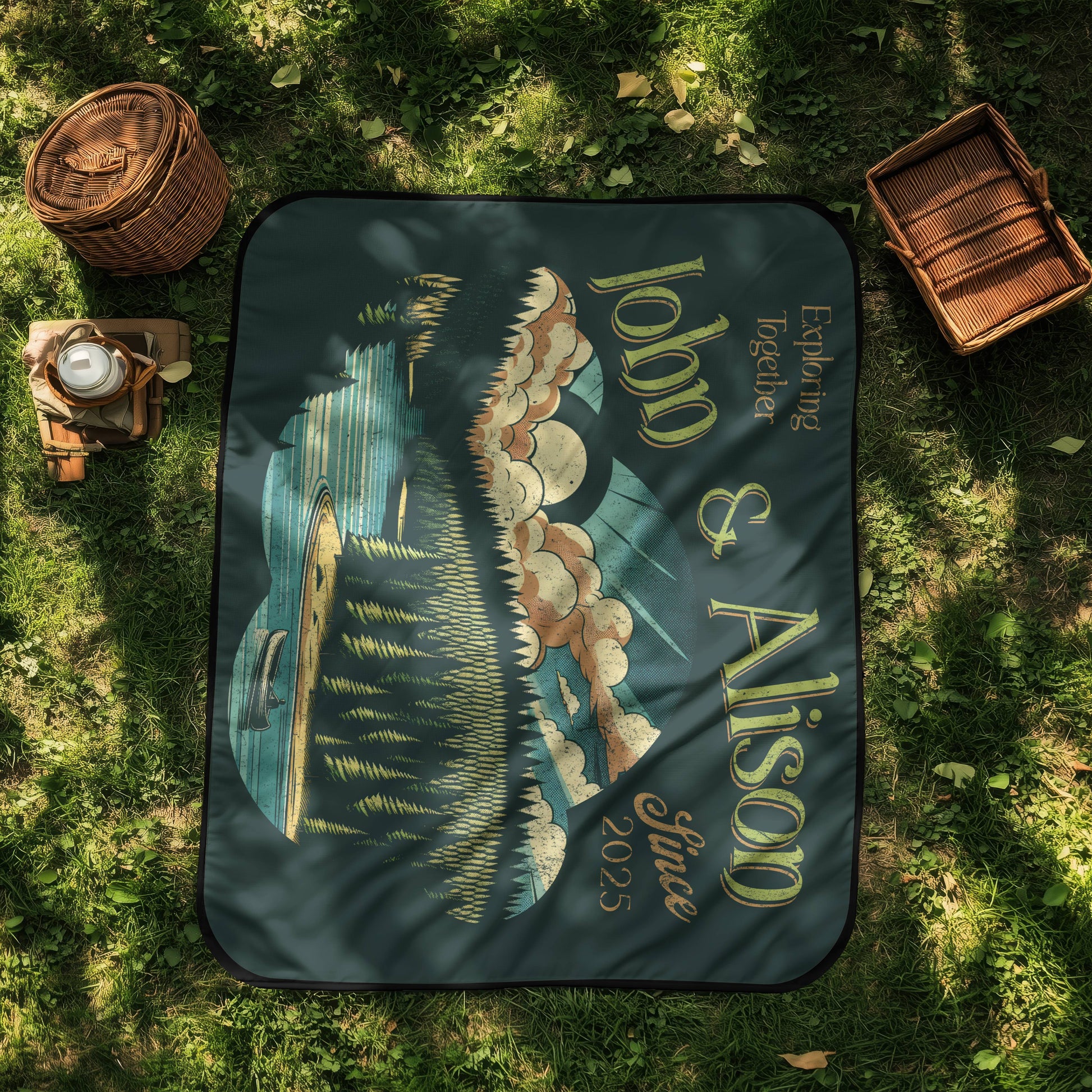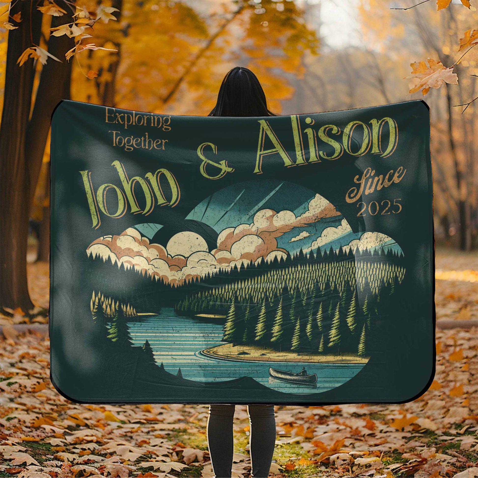 Stay cozy, comfy and dry on your next camping trip with our Cedar Current Blanket. Featuring a forest landscape, complete with a river and sunset plus customizable names and date. Enjoy the comfort and durability of our expertly crafted blanket.