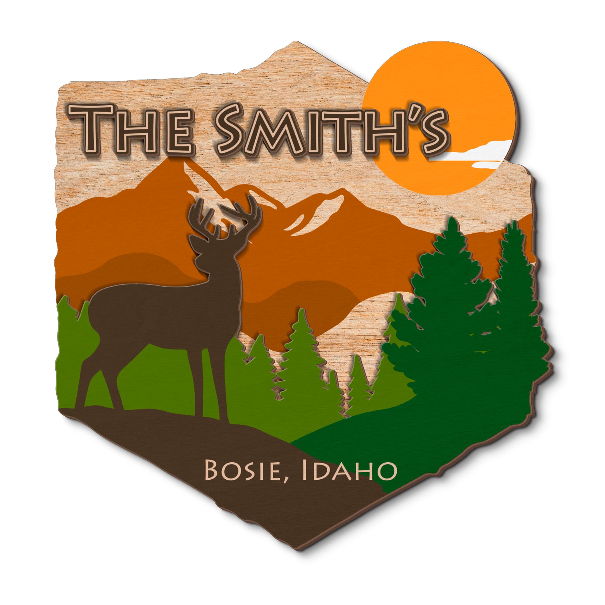 Introducing the Deer Lookout Sign, a laser cut and lightweight wooden sign, perfect to accent the inside of your RV. Featuring a deer silhouette, mountain vista, evergreen forest and customizable name and location. Perfect for outdoor enthusiasts, RV travelers and campers.