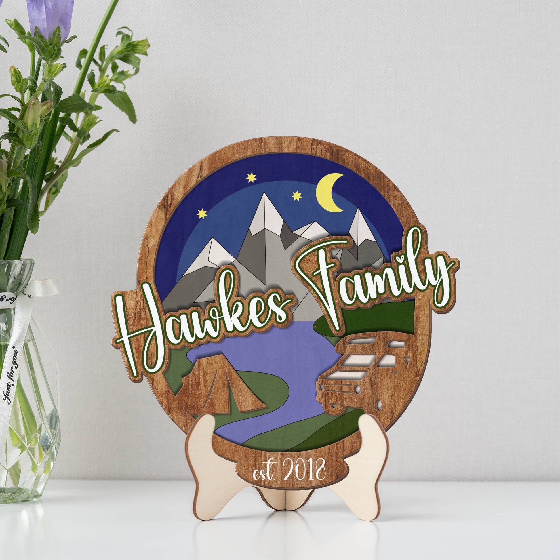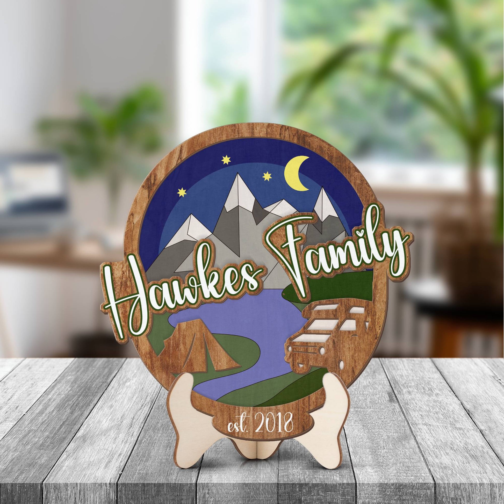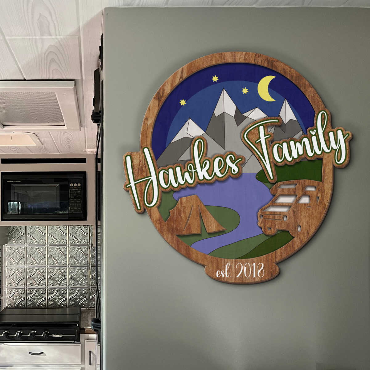 Introducing the Peakside Camper Sign, a laser cut and lightweight wooden sign, perfect to bring the wild mountains into your home. Featuring a night mountain scene, tent and RV silhouette and customizable family name, and date. Perfect for outdoor enthusiasts, RV travelers and campers.