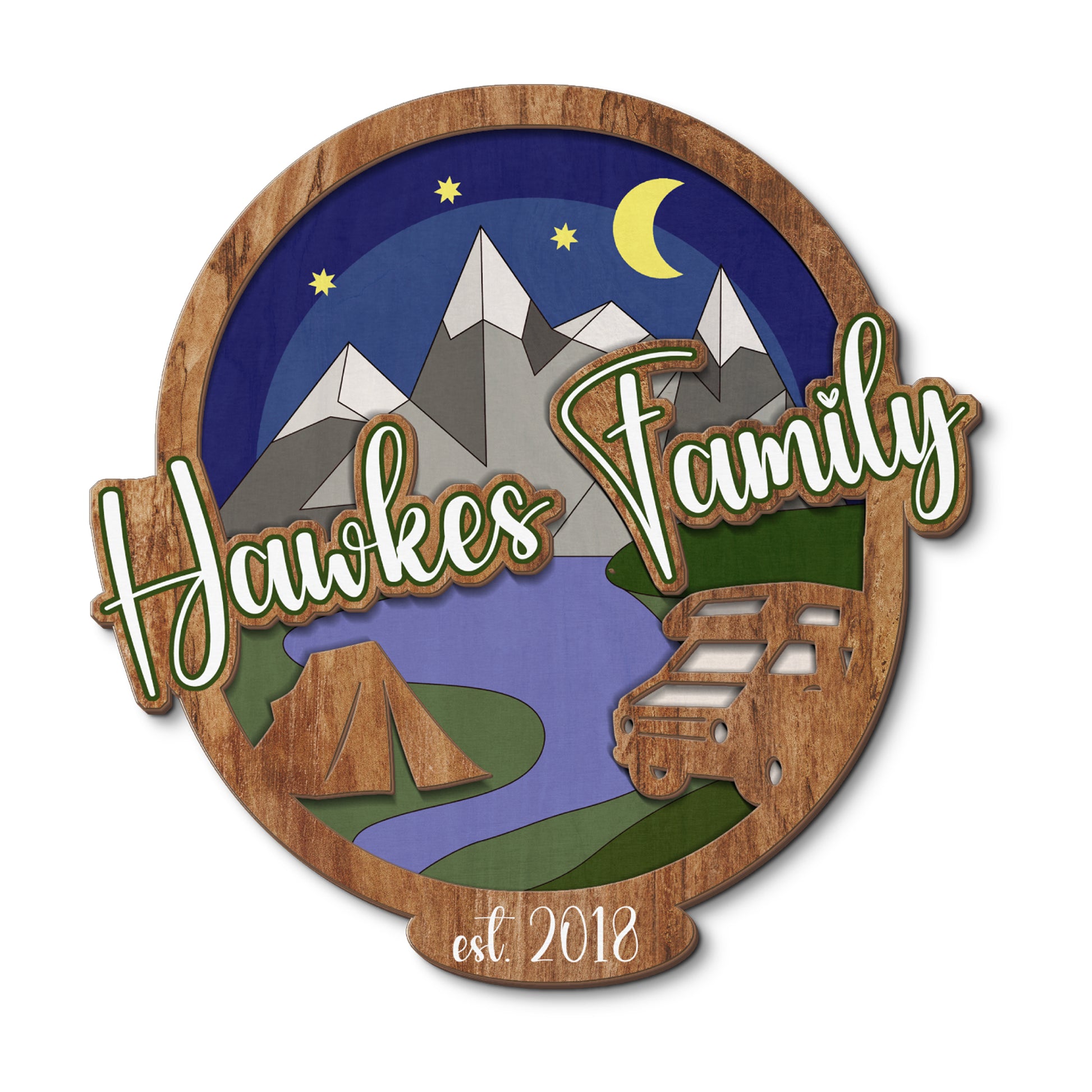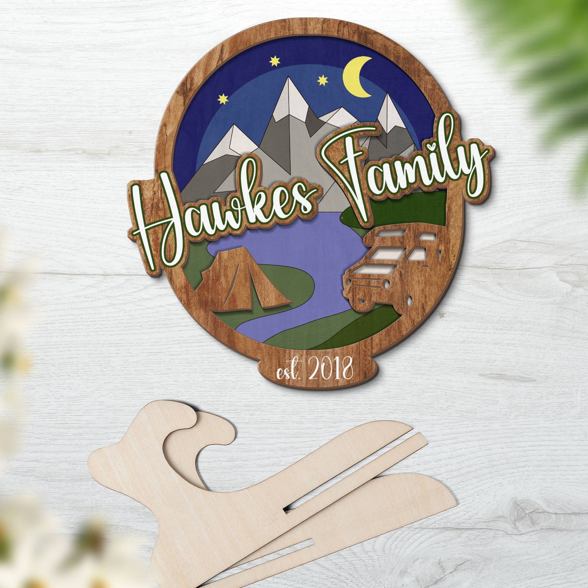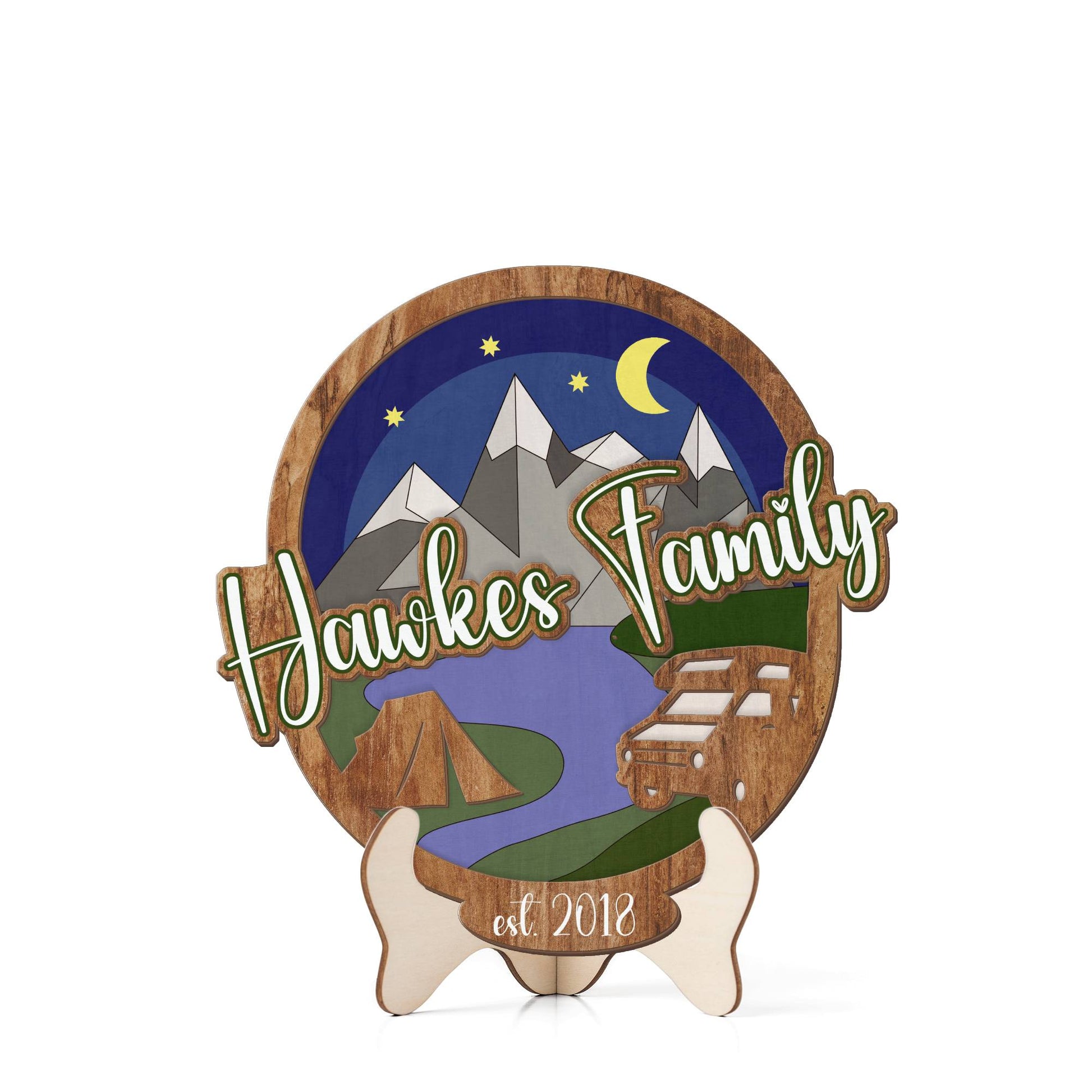 Introducing the Peakside Camper Sign, a laser cut and lightweight wooden sign, perfect to bring the wild mountains into your home. Featuring a night mountain scene, tent and RV silhouette and customizable family name, and date. Perfect for outdoor enthusiasts, RV travelers and campers.