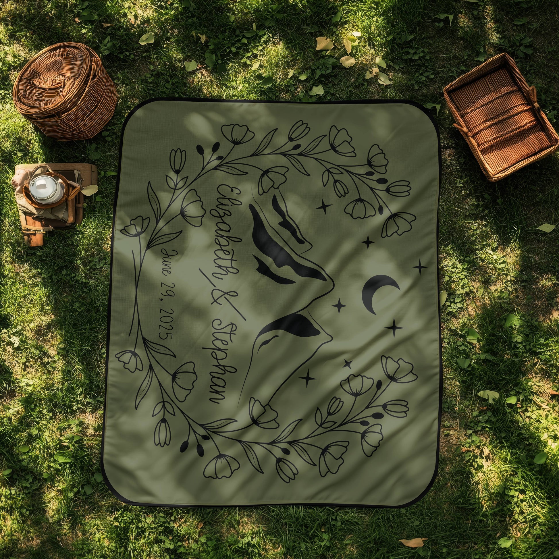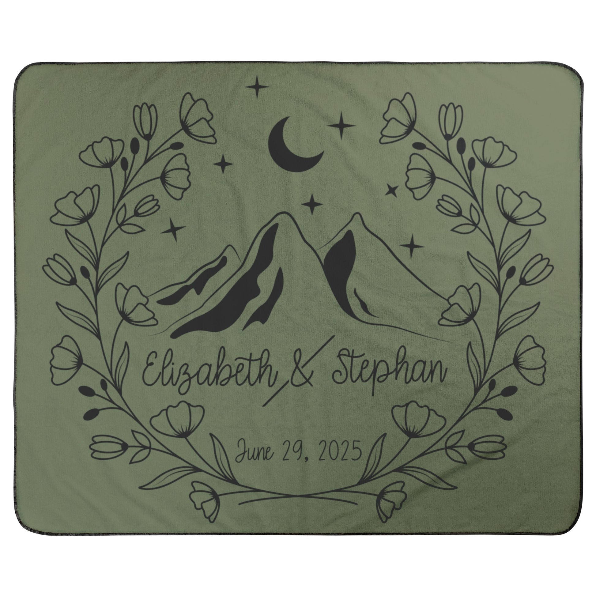 Stay cozy, comfy and dry on your next camping trip with our Summit Love Blanket. Featuring a mountain silhouette with a floral wreath accent, plus customizable names and date. Enjoy the comfort and durability of our expertly crafted blanket.