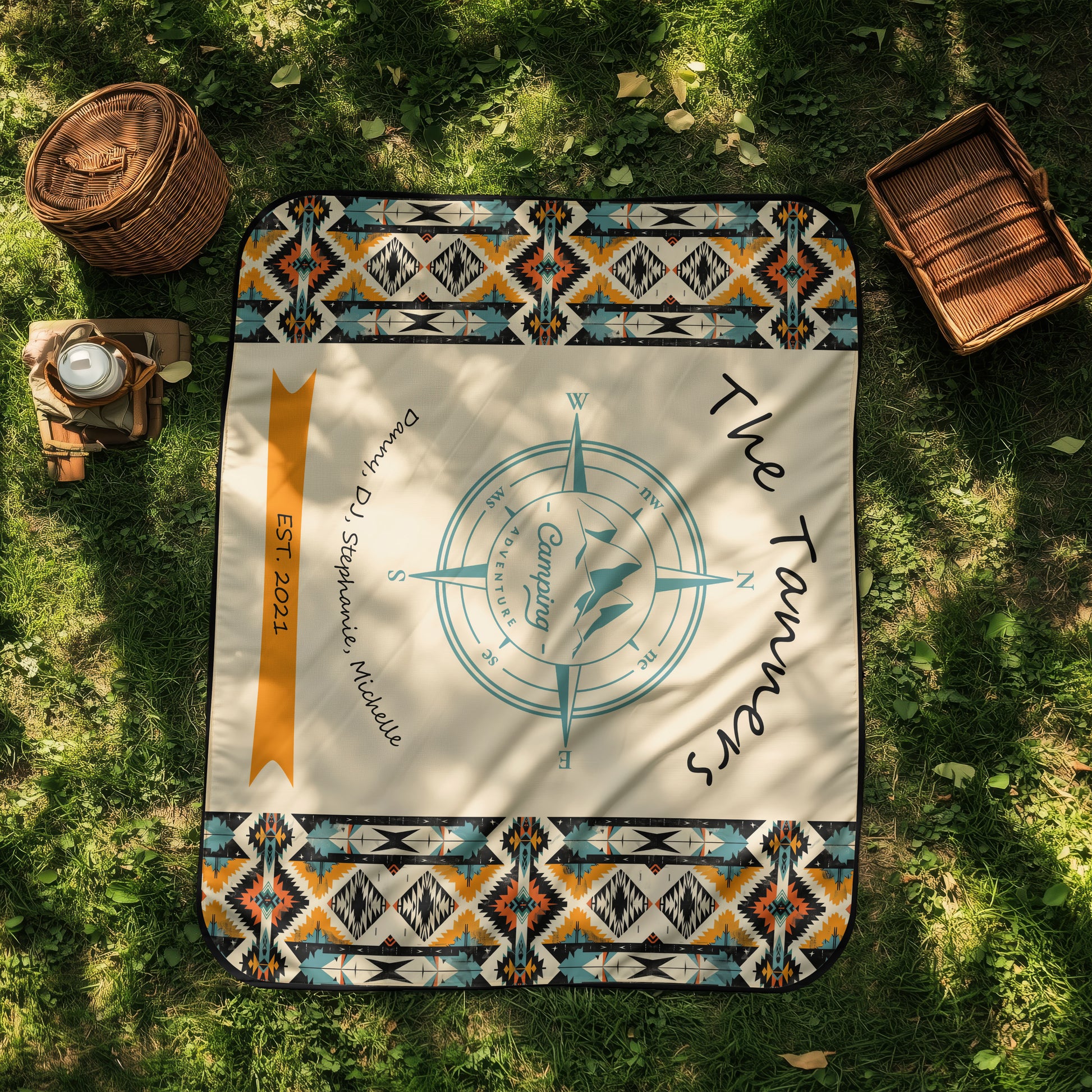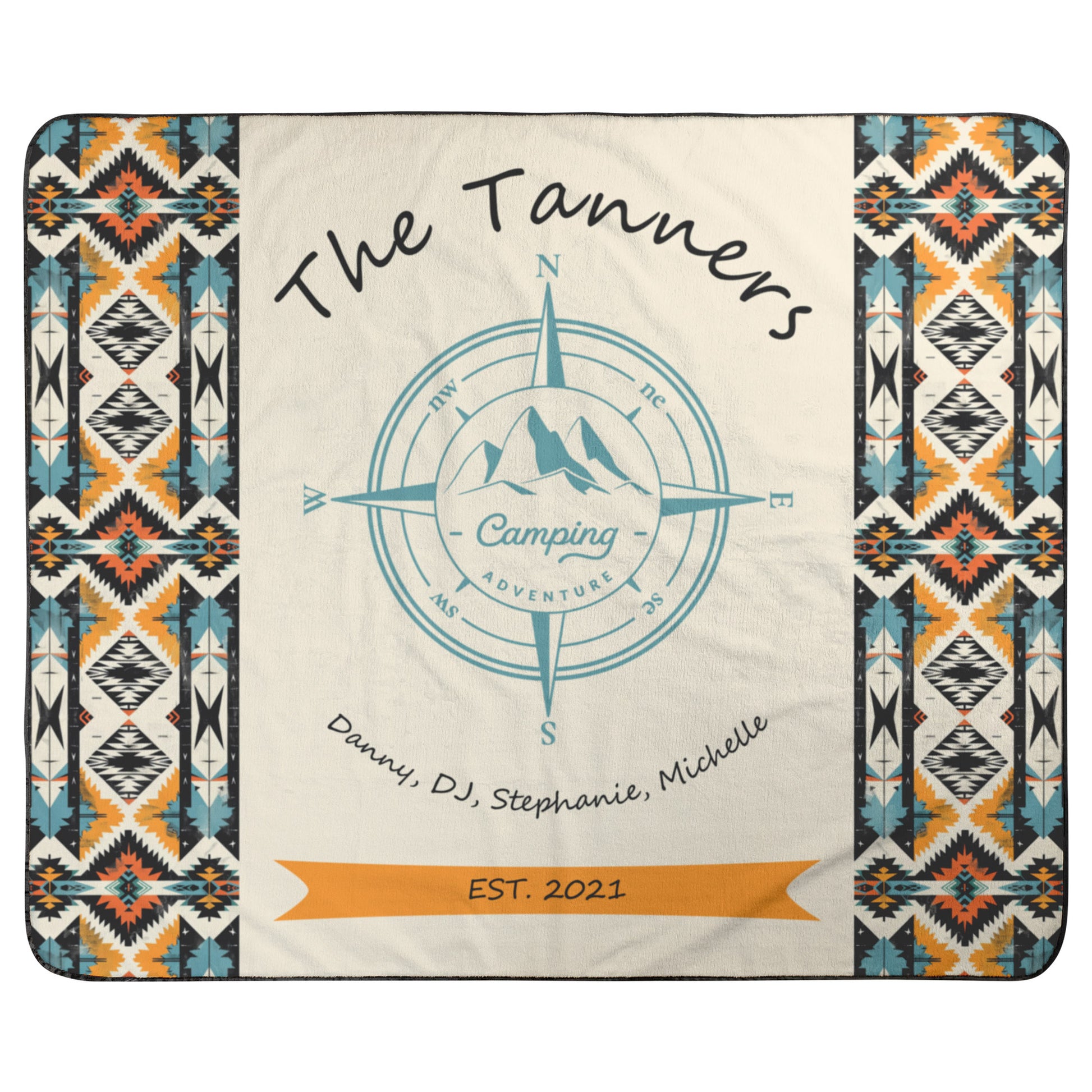 Stay cozy, comfy and dry on your next camping trip with our Tribal Camping Adventure Blanket. Featuring a tribal border, mountain compass and customizable names and date. Enjoy the comfort and durability of our expertly crafted blanket.