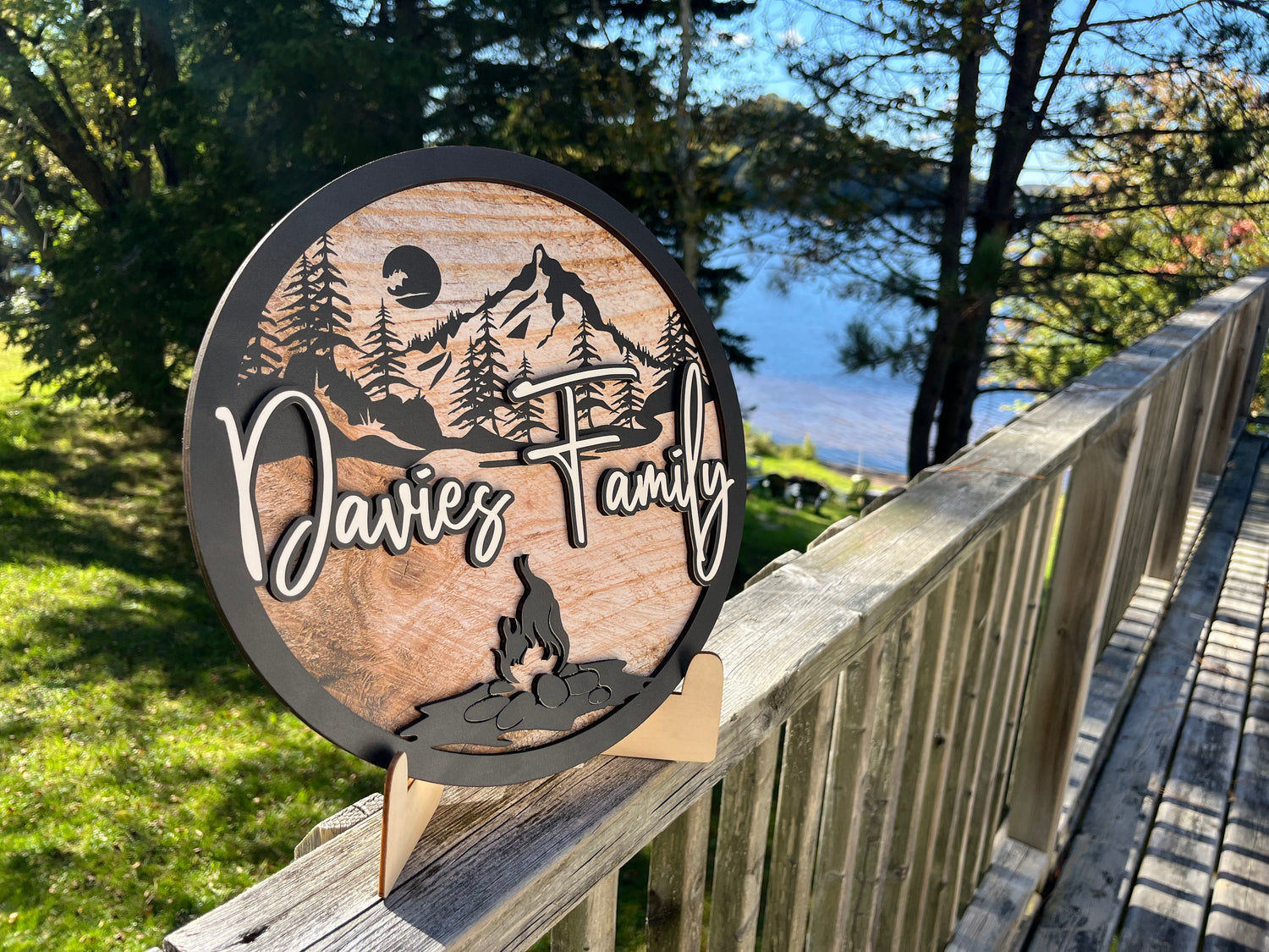 Introducing the Twilight Campsite Sign, a laser cut and lightweight wooden sign, perfect to spruce up the inside of your RV. Featuring a twilight forest scene, roaring campfire, traditional tent and customizable family name and date. Perfect for outdoor enthusiasts, RV travelers and campers.